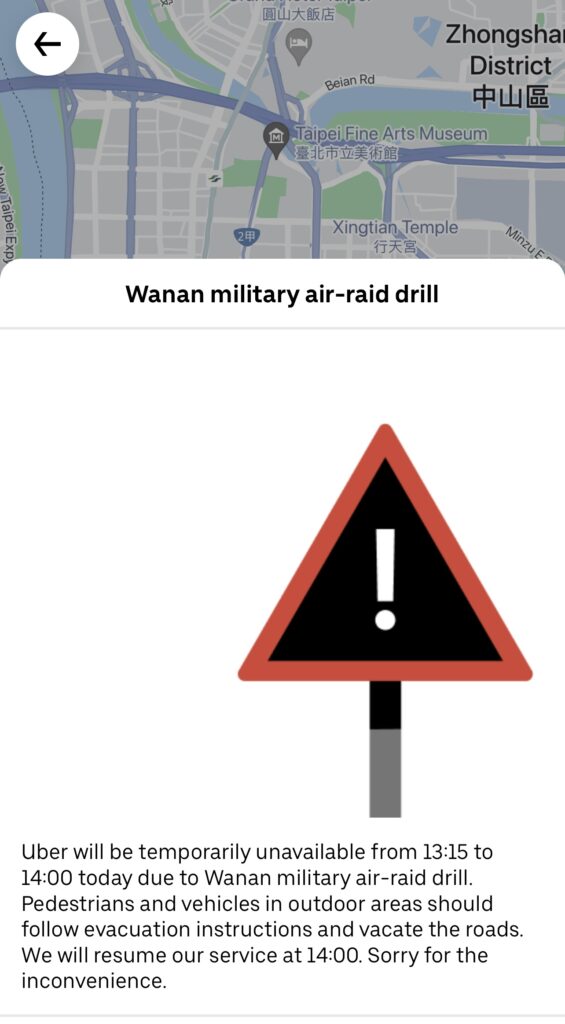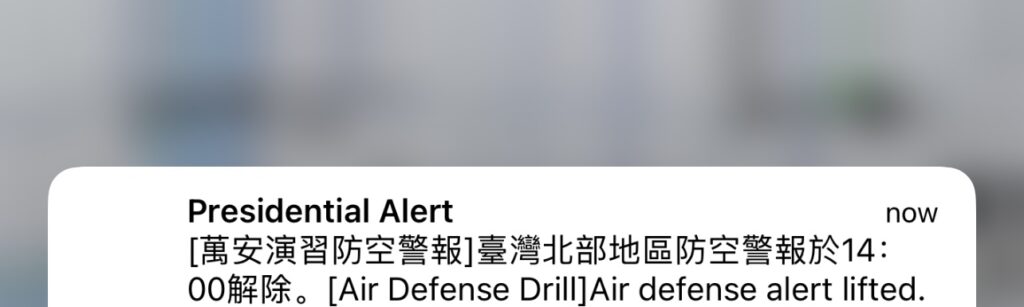 どういうこと??と思ってお店の人に聞いたら、「今日は台湾有事のための軍事演習があるから、これから1時間は全員建物内に待機です。外には出られません」と!