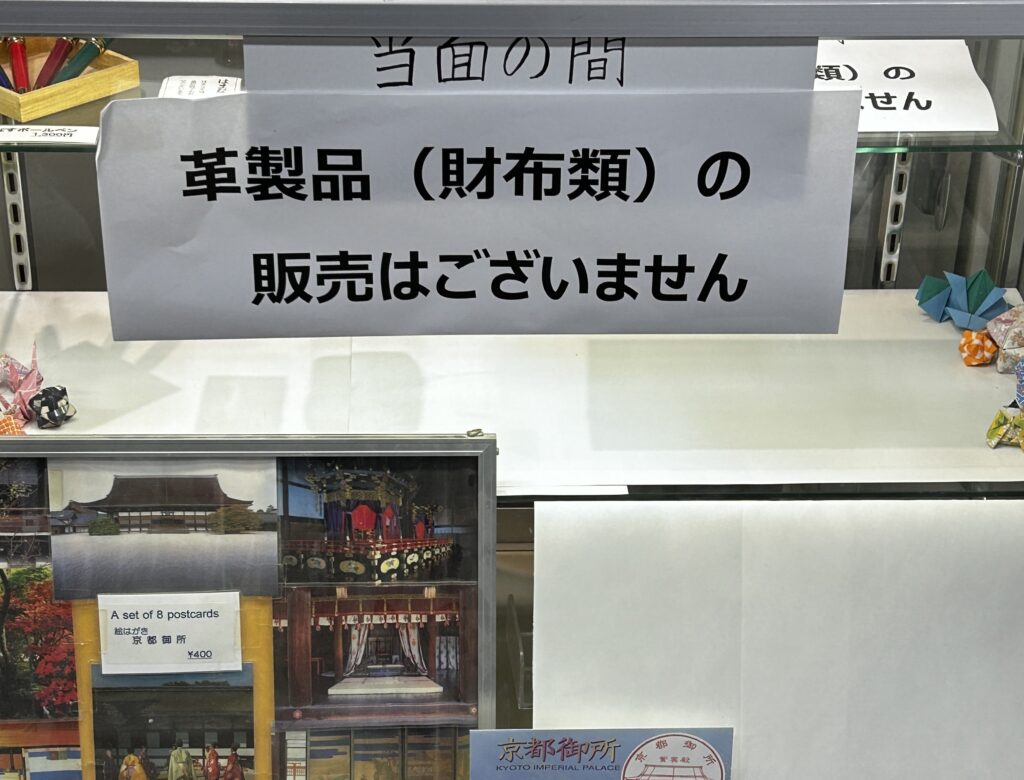 残念ながら、当面の間、革製品(財布類)の販売はございません、の貼り紙でした。