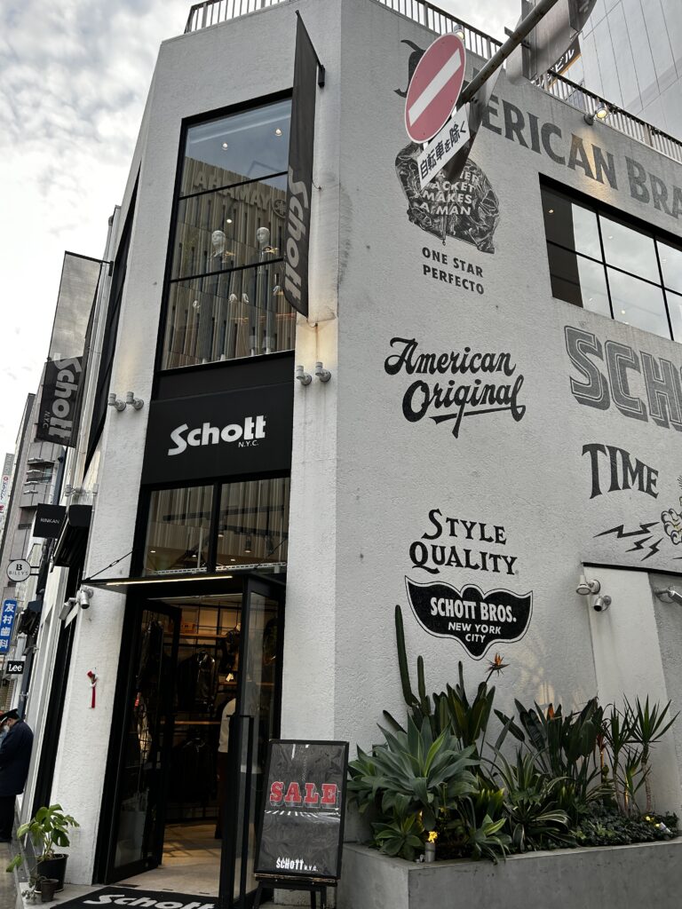 日本にいた時に夫が好きだったSchottは、半袖の服がなく、残念ながら見ただけ。