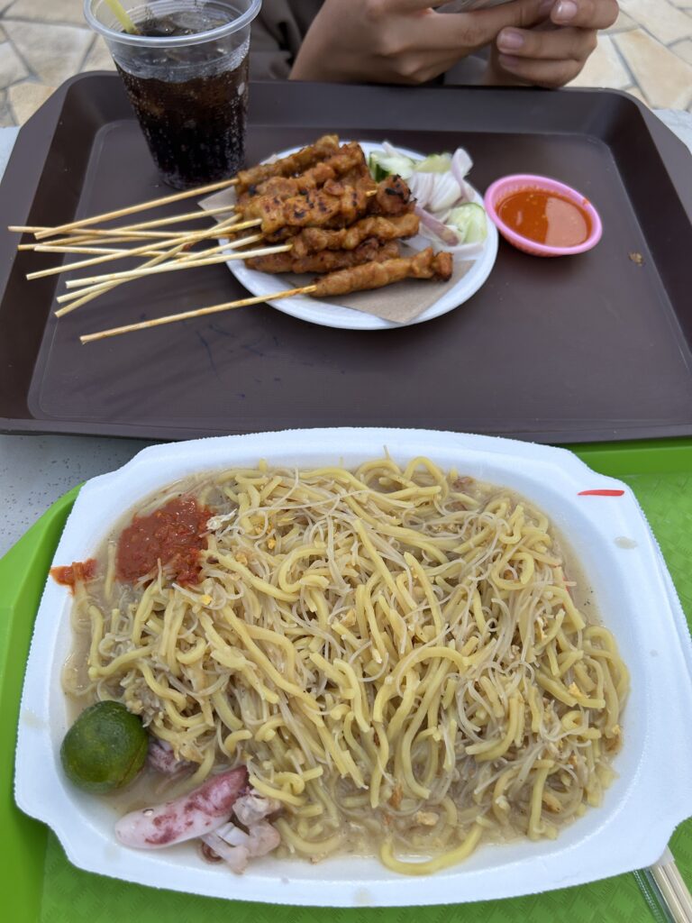 サテーもホッケンミーもそれぞれ$10、やっぱり観光地価格だけども。