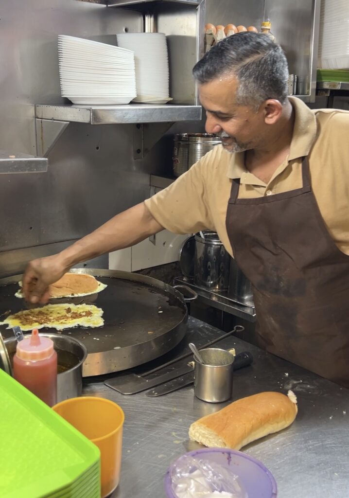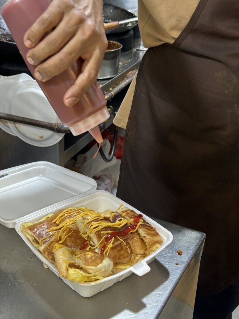 大きなコッペパンみたいなものに、卵とマトン肉とチーズを焼いて挟んだロティジョン。すごいボリュームで夫でも1回で食べきれず、2食分にしていた。