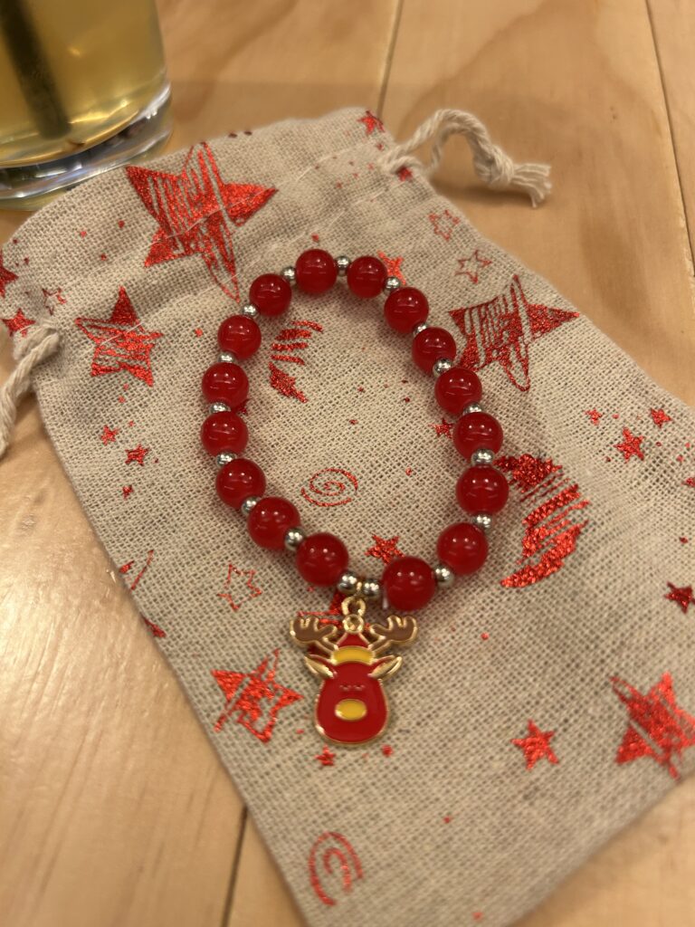 クリスマスフェアで私にもプレゼントを買ってきてくれて、かわいいトナカイの赤いブレスレットでした。12月はこれ着けますよ。