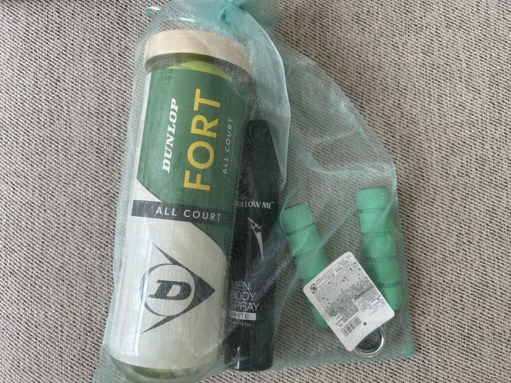 夫には、テニスボールとボディスプレーとハンドグリップのセットでした。
