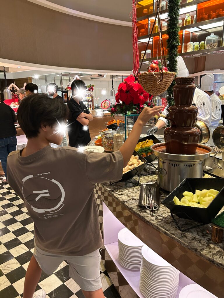 甘いものに興味がない息子はチョコレートファウンテンで少しだけお菓子を食べて満足。チョコレートを食べたいというより、ジョジョ立ちしてファウンテンにお菓子をつっこみたかっただけっぽい。男子ってやつは。。